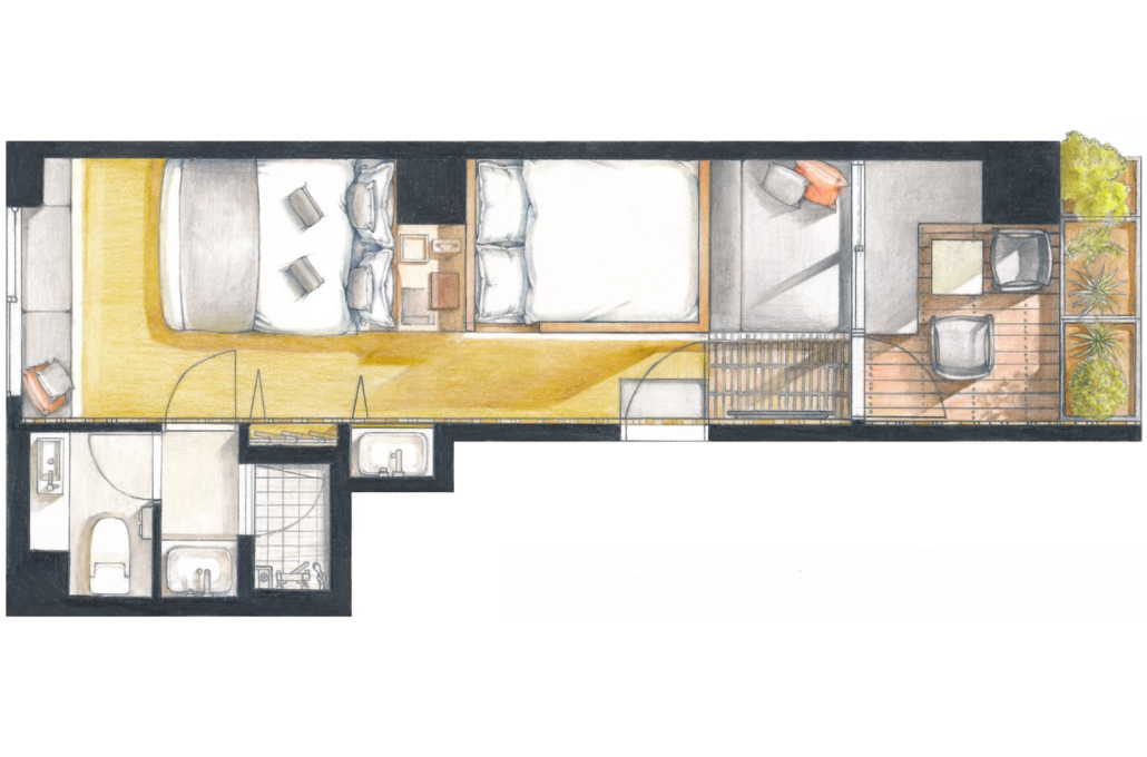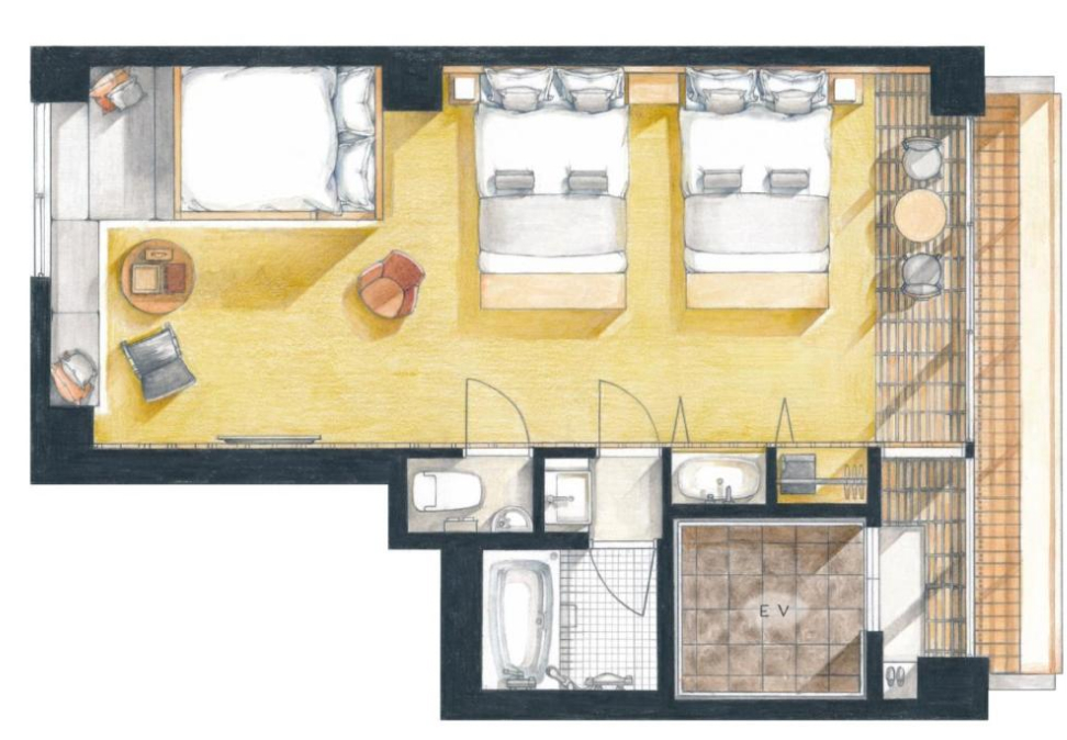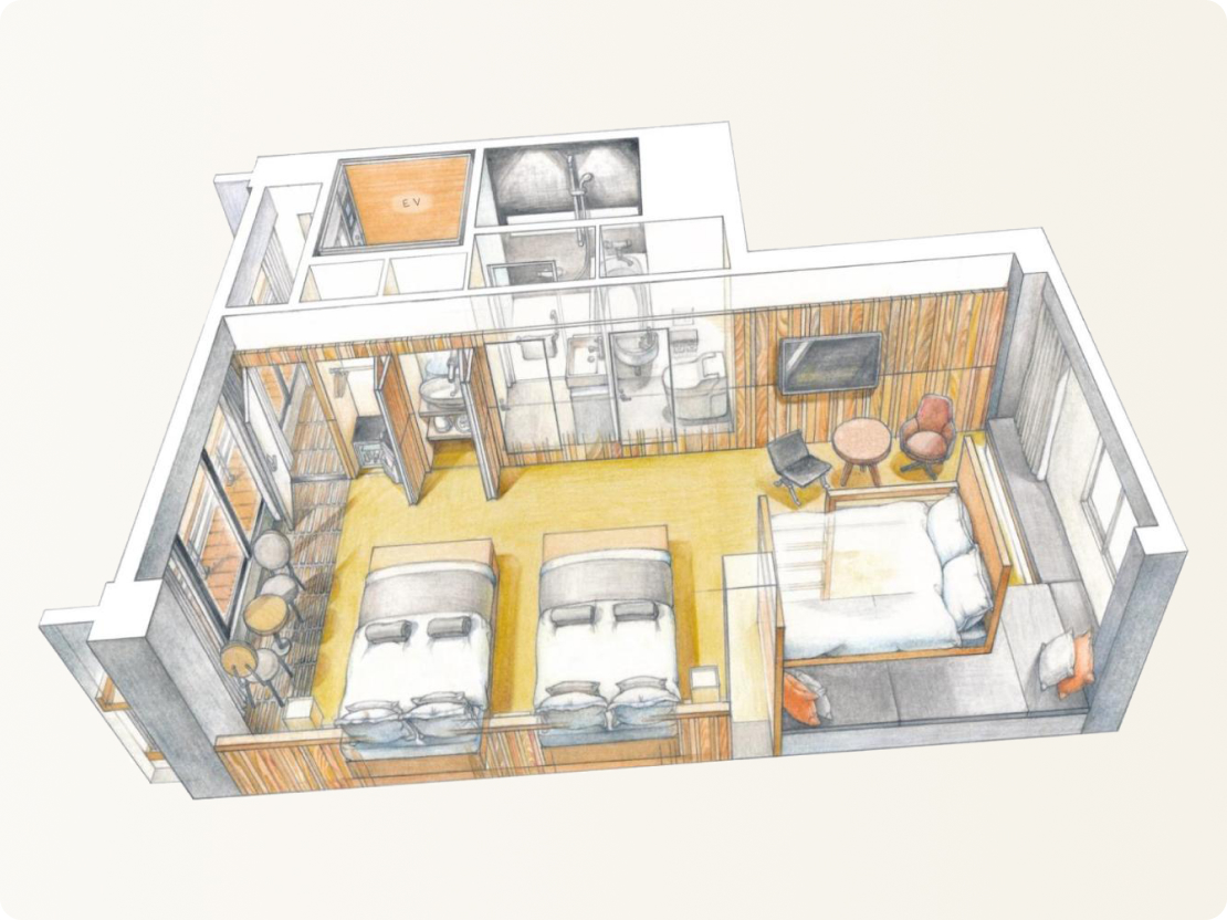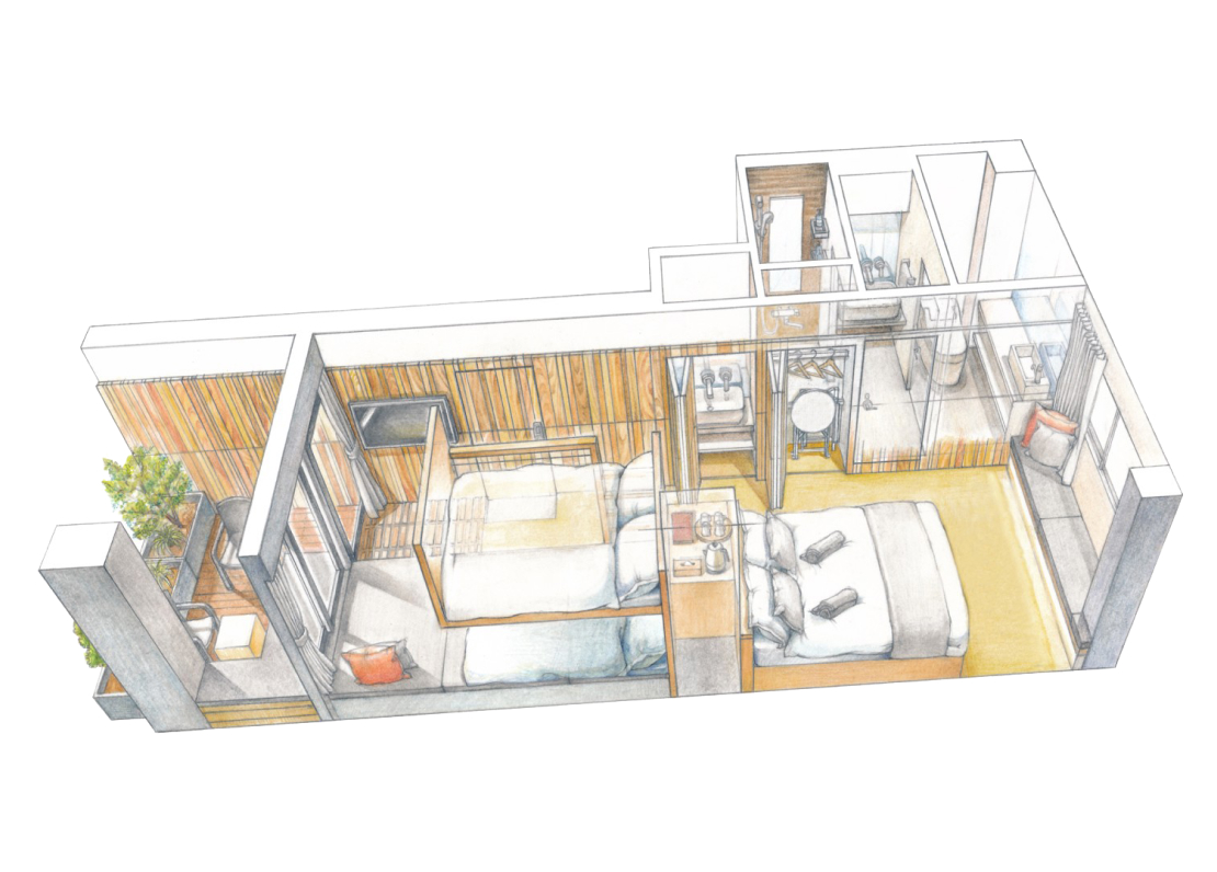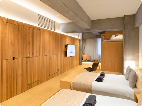 その代わりとしてお客様に快適にお過ごしいただけるよう、ホテル共用部を縮小し、より広いお部屋を提供しております。
